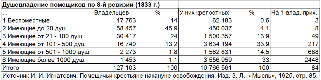 В 1833 году 84 % помещиков имели, в среднем, менее 19 крепостных на помещика.